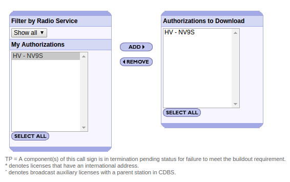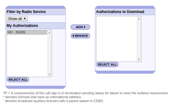 button to move that call sign to the right window labeled Authorizations to Download.